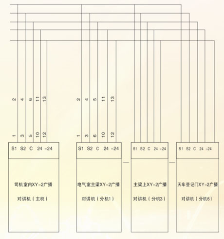 XY―2型系列產(chǎn)品廣泛應用于冶金、電力等行業(yè)的有線對講系統(tǒng),在天車上其主站安裝在司機室,分站可以分布在電力室內(nèi)、高壓室、大小車上和天車登機門。該系統(tǒng)由若干臺廣播對講機組成一個機內(nèi)通訊網(wǎng)絡,各個有線廣播站內(nèi)置揚聲器和送受話器,任何一個廣播站喊話,其余話站均能接通廣播。可以使生產(chǎn)人員方便地與天車操作人員取得聯(lián)系。在各個站操作時無需撥號,可以方便的實現(xiàn)一對一講話,各話站并列接線,用戶可根據(jù)工藝要求任意擴充,每個話站都是一個獨特的系統(tǒng),任一臺損壞,不會影響其余分站正常工作。在起重設備上可以方便地實現(xiàn)上下車聯(lián)系,機內(nèi)操作人員相互通訊。接線原理框圖參見附錄。